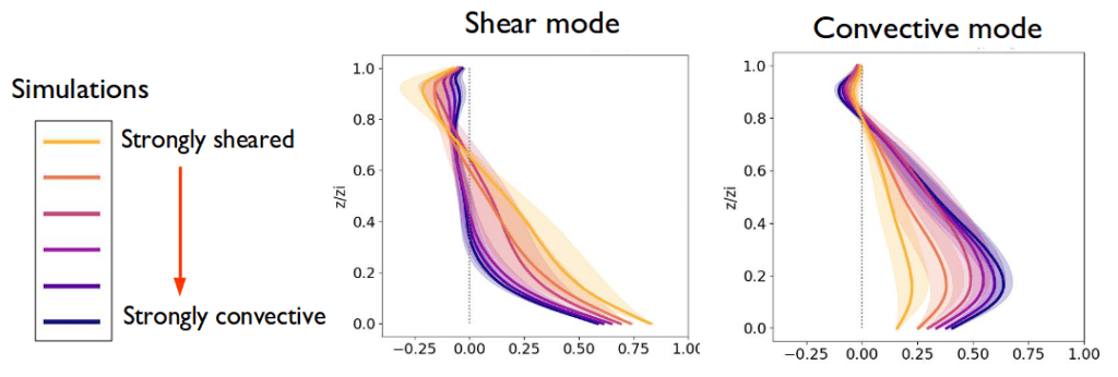 I conduct research on the atmospheric boundary layer using innovative machine learning techniques that incorporate physical knowledge to improve our understanding of the physics of the convective boundary layer, specifically during sunny afternoon situations. One of my objectives is to develop a data-driven parameterization of the boundary layer vertical turbulent fluxes. To achieve this, I enforce a physical constraint in the architecture of a neural network. This allows me to decompose the total flux into two primary modes of variability, one associated with shear-flow interaction, and the other with surface heating and flow interaction. Wind shear and surface heating are the two main forces that control the dynamics of the ABL. Above is a plot that demonstrates this decomposition, which has significant implications for understanding the dynamics of the atmospheric boundary layer and improving the representation of its processes in climate and weather models.