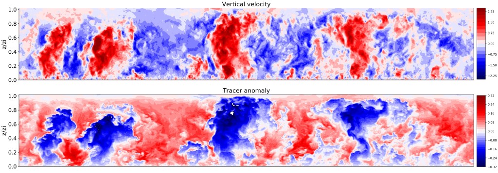 The plot shows the vertical profile of vertical velocity and a height dependent tracer anomaly in convective boundary layer. The data is generated using Large Eddy Simulation